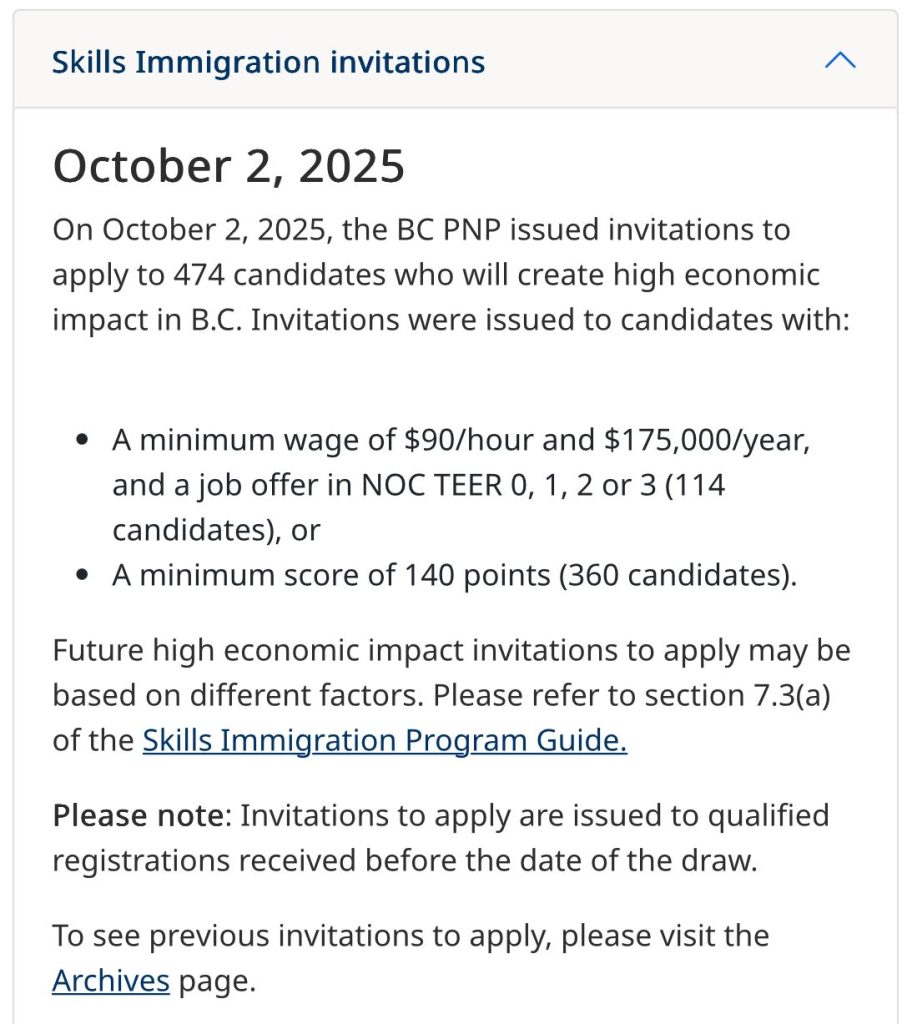 The last BCPNP draw, held on October 2nd, 2025, sent out approximately 485 invitations across different streams!